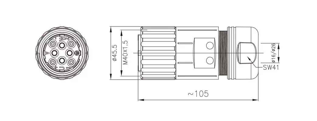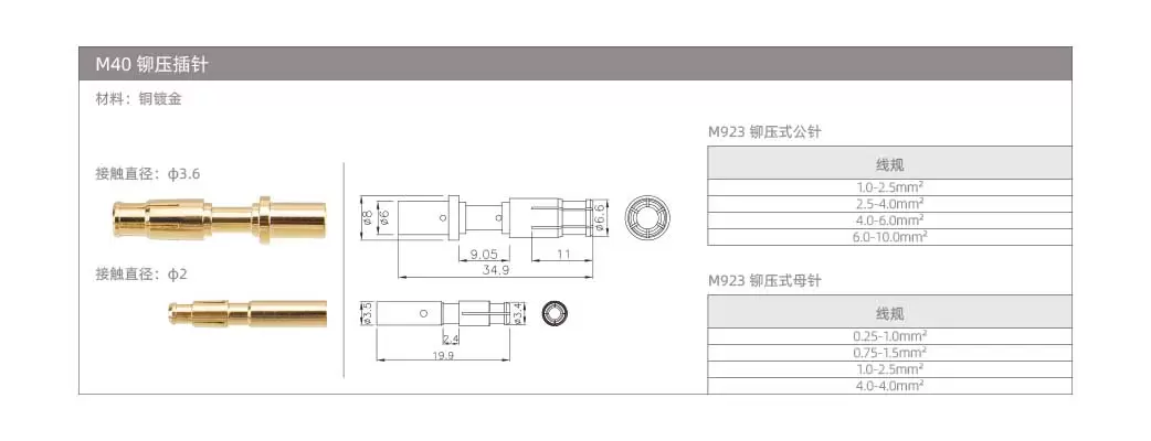 यूरोपीय मानक कनेक्टर M40 श्रृंखला संरचना प्रकार: धातु असेंबल प्लग पिन प्रकार: महिला प्रकार संपर्क संख्या: 6,8पिन कनेक्शन विधि: क्रिम्प शील्ड: हाँ प्रमाणीकरण: CE,RoHS,UL, मानक: IEC 61076-2-101